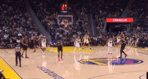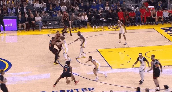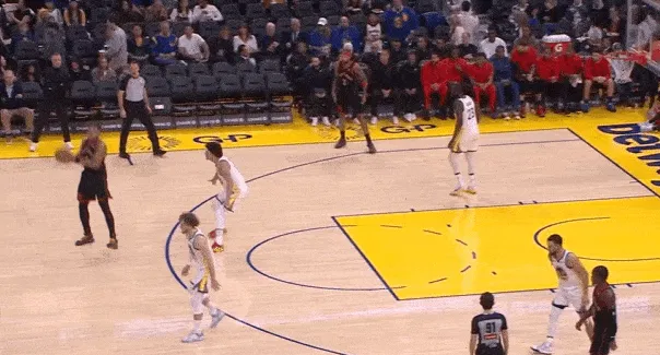 弧顶接巴恩斯击地后立即发动挡拆,借掩护摆脱追防人后压低重心加速突破,行进间挂着回退篮下协防的桑托斯直接起抛投终结打进2+1。
