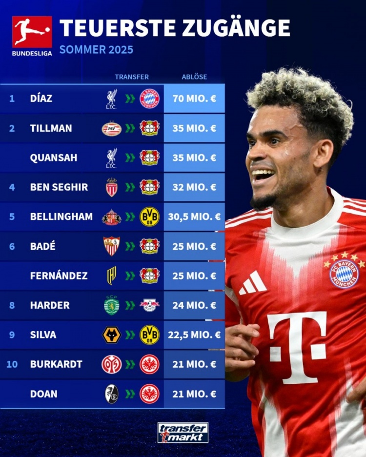9月4日德甲夏季转会窗口正式关闭,《转会市场》公布了今夏联赛引援身价排行榜,其中路易斯-迪亚斯以显著优势位居榜首。
