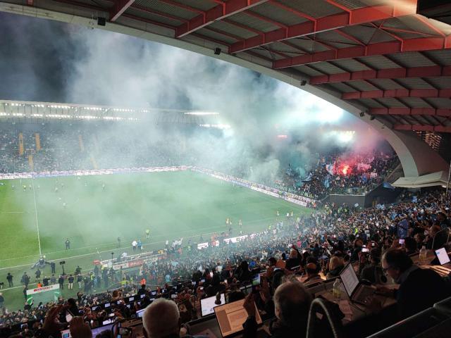 那不勒斯最终没有成为齐国,那不勒斯球迷也从未偃旗息鼓。乌迪内这个地方本就没那么好占领,但今晚那不勒斯球迷还是将达奇亚竞技场装扮成了蓝色的海洋,这个主场以涂装的七彩座位著称,今天看上去七色汇聚成了同一种颜色。主队似乎只占据了一面看台,剩下的三面看台都归了那不勒斯所有。他们挥舞着更巨大的旗帜,呼喊出更高的分贝,那不勒斯人真正做到了反客为主。