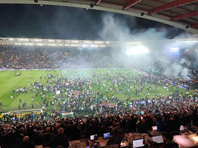 并不是所有的球迷都近距离接触了心中的偶像,闲下来的一部分人选择了去挑衅主队球迷,乌迪内斯可不像萨索洛那么没存在感,去年米兰最后一轮在萨索洛夺冠,同样是冲进场内,萨索洛是一点反应都没有。今天则不然,乌迪内斯球迷以勇猛凶悍著称,见到挑衅也纷纷冲进了场内。他们身穿一身黑衣,见到那不勒斯球迷就追打,一时间乱作一团,防暴警察介入之后,已经分不清这三方是谁在打谁了。另一边其他那不勒斯球迷见势不妙,迅速撤离。警察用身体排起了人墙,将两边的极端球迷分开,你在这边骂,我在那边喊,那不勒斯的夺冠庆祝以一场闹剧而结束。