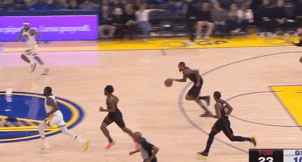 奎克力上提弱侧接球后猛龙立即衔接牛角站位起手发动后续进攻,奎克力走谢德一侧直接启动突破利用速度一步过掉波杰直杀篮下,行进间起抛投终结躲避连忙回收篮下护框的追梦。