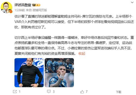 詹俊:“估计看了直播的球迷都能理解富勒姆主帅马科-席尔瓦的愤怒与无奈。上半场那个VAR介入判罚穆尼斯犯规可以接受,但下半场初段那个点球在看完视频回放以后还吹,那就有点过分了。
